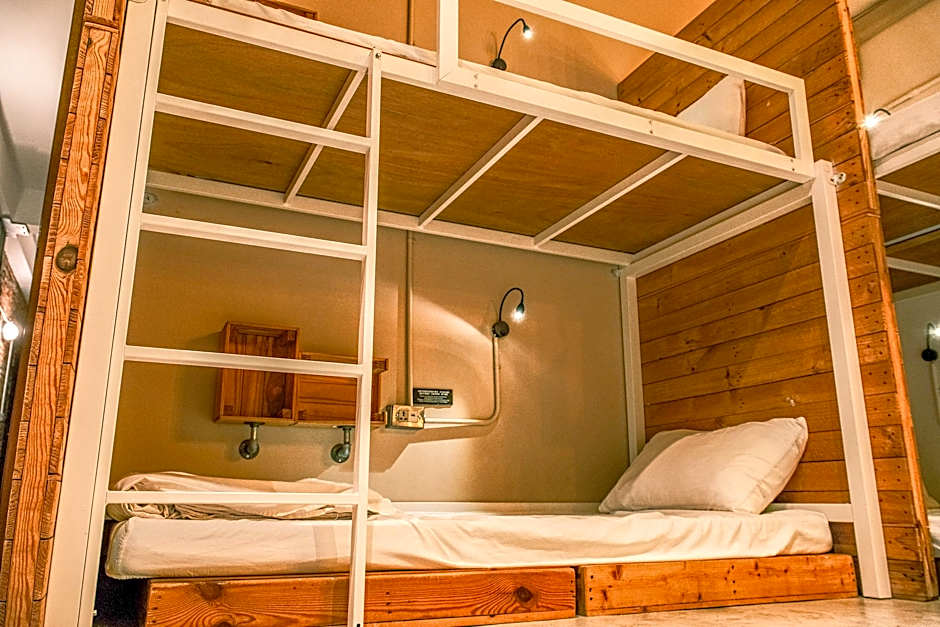 It is a upper deck double bed with wooden floor below and it features air conditioning, a small living room and shared shower facilities.